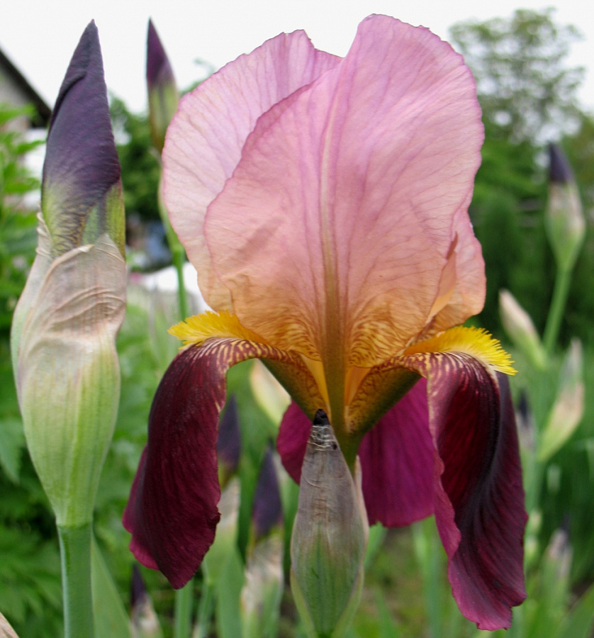 Рассада ириса германского Индийский лидер (Indian Chief) создаст на участке праздничное настроение на весь период своего цветения. Этому способствует красивая расцветка бутонов и легкий приятный аромат, который от него исходит. Оттенок верхних лепестков светло-розовый с легким фиолетовым отливом, а вот нижние—насыщенно-бордовые с белыми вкраплениями у оснований и желтой бородкой.