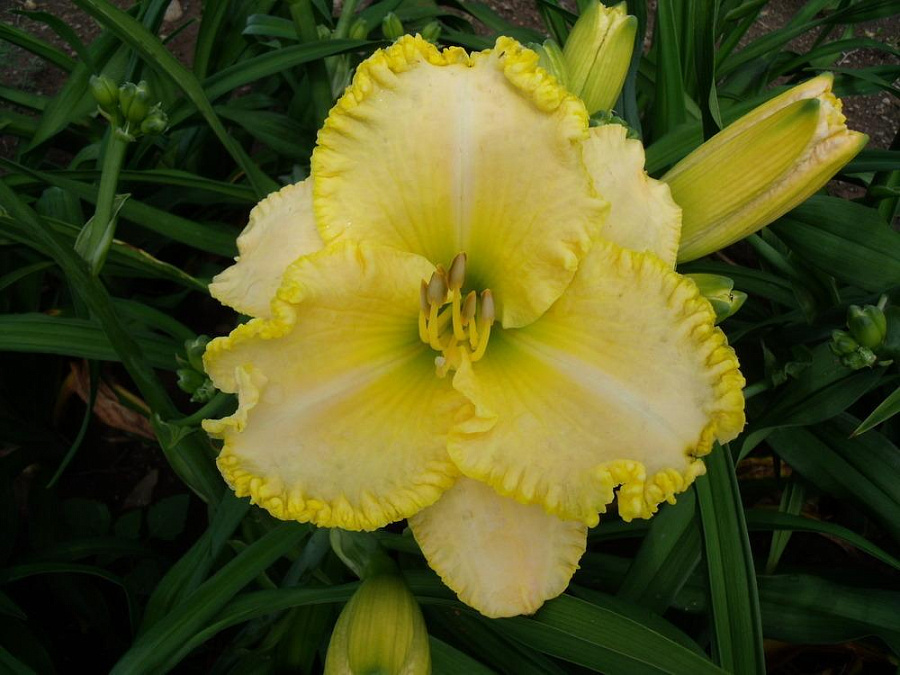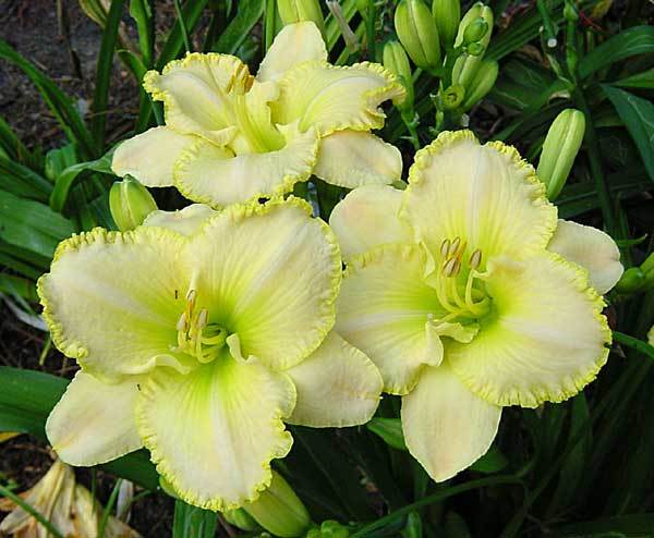 Рассада лилейника Фест Найт (First Knight) придется по душе тем цветоводам, которые ценят простоту и элегантность. Растение цветет крупными бутонами по несколько штук на одном стебле, создавая своеобразный букет. Цвет лепестков имеет нежно-желтый оттенок, а по краю идет обрамление гофрированной золотистой каймой.
