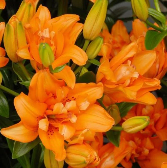 Лилия азиатская махровая "Дач Твин" - это великолепное растение с оранжевыми махровыми цветками, которые радуют глаз своей красотой. Этот сорт отличается высокими показателями по размеру цветка - до 17 см, что делает его по-настоящему величественным и элегантным. Листья лилии имеют интересную форму, что придает растению особый шарм.