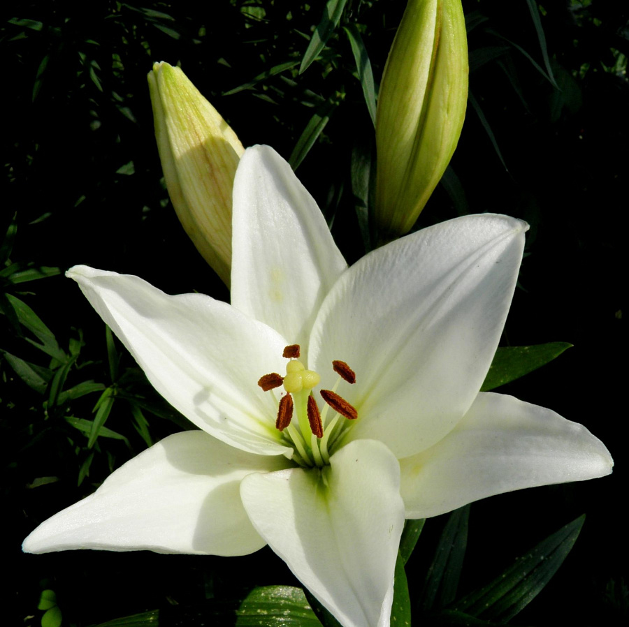 • Окраска цветка : Высоко рентабельная чисто-белая лилия. Крапа нет, в горле слегка зеленоватая. Пыльники коричневые, рыльце светлое, плотная фактура лепестков