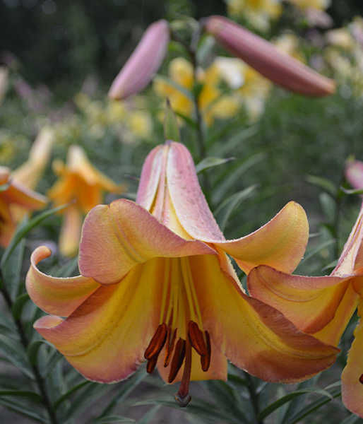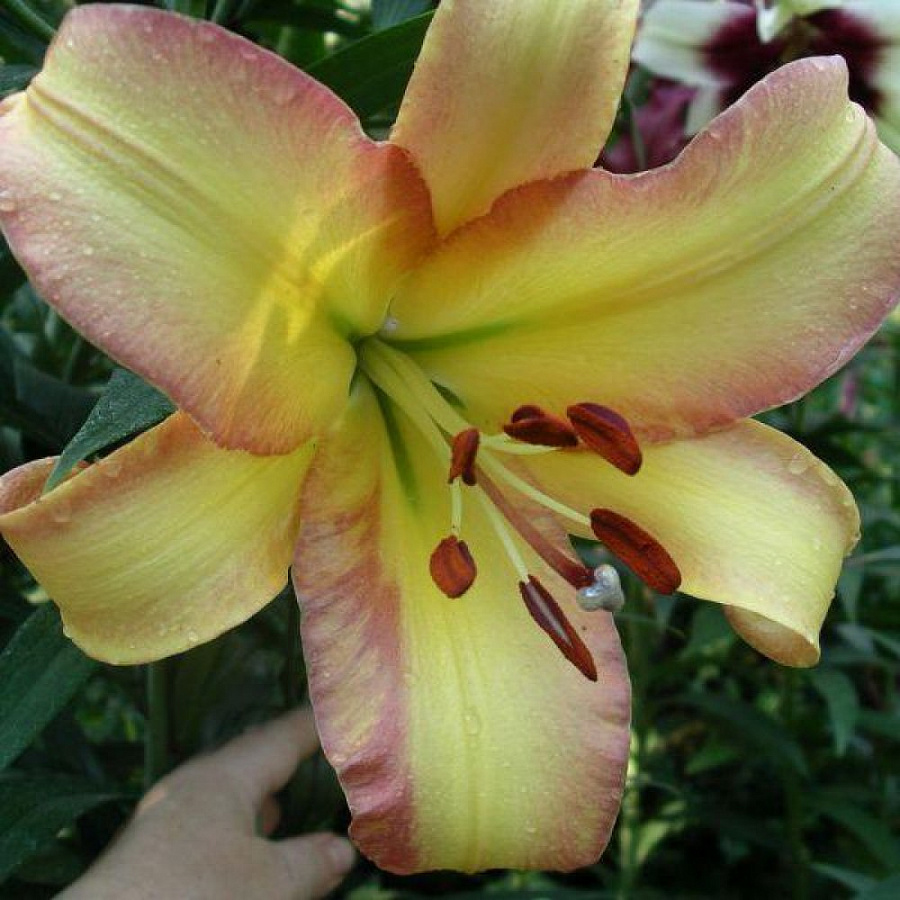 • Окраска цветка : желтый с палево-розовой каймой и темными пыльниками