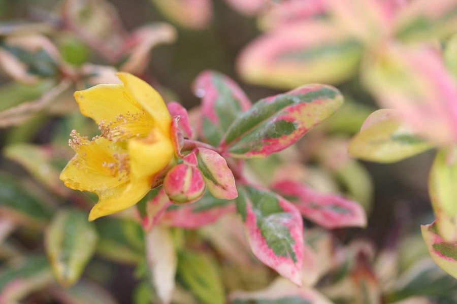 Саженцы зверобоя Триколор (Tricolor) имеют поникающие, изящные стебли и вырастают около 50 см в высоту. Побеги обладают ярко-красным тоном. Листики продолговатой формы, зеленого окраса с розовой каймой по краям. Цветет небольшими желтыми цветочками с июня по август. Цветение обильно покрывает кустик. Плюсы зверобоя Триколор: - неприхотлив в уходе - яркое цветение - может расти в контейнерах Саженцы лучше высаживать на защищенных от ветра местах с рыхлой, дренированной почвой. Растение светолюбиво. Применяется для посадок вдоль дорожек, в альпинариях или каменистых декорациях.